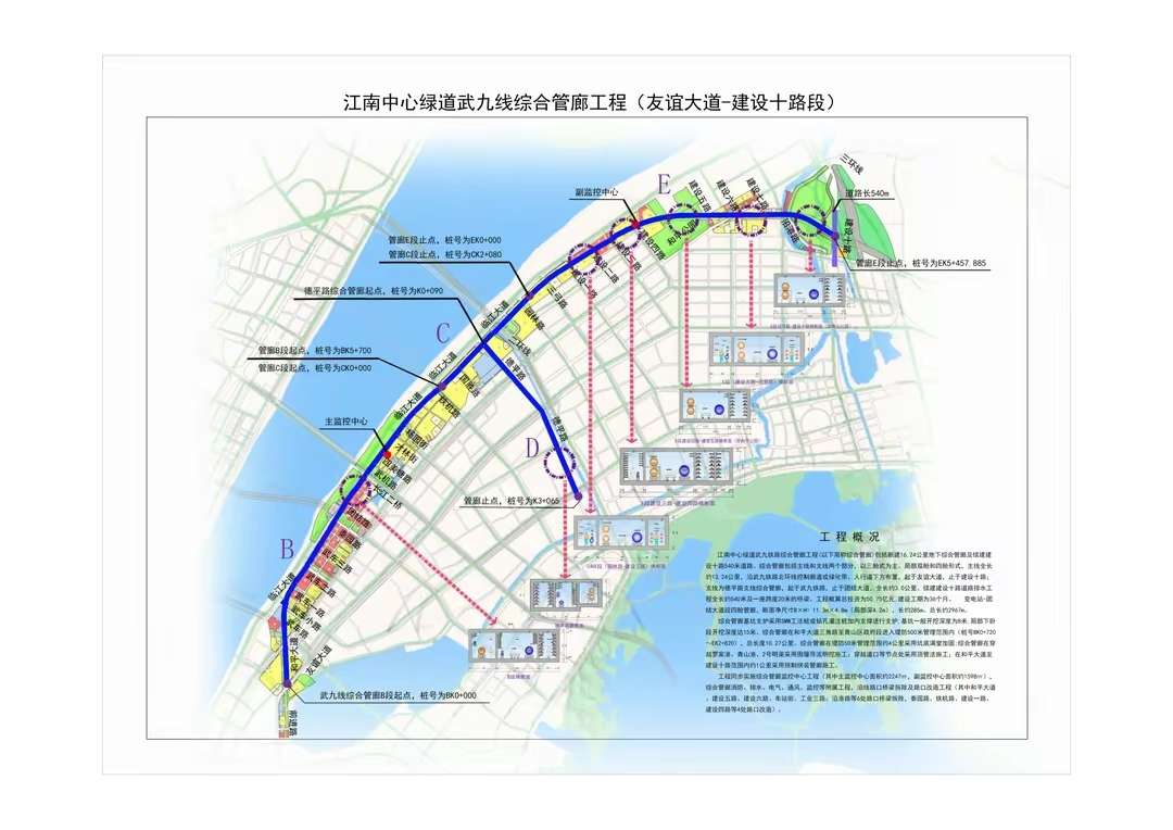 作為省市兩級(jí)重點(diǎn)工程,武九綜合管廊全長約16.2公里,是武漢市城市地下綜合管廊專項(xiàng)規(guī)劃確定的重要干線管廊,創(chuàng)下多個(gè)“國內(nèi)之最”。它是國內(nèi)城市核心即老城區(qū)單次建設(shè)規(guī)模最大(長度、斷面)的綜合管廊,是服務(wù)城市核心功能區(qū)(武昌濱江商務(wù)區(qū)、青山濱江商務(wù)區(qū)、華中金融城)數(shù)量最多的綜合管廊。